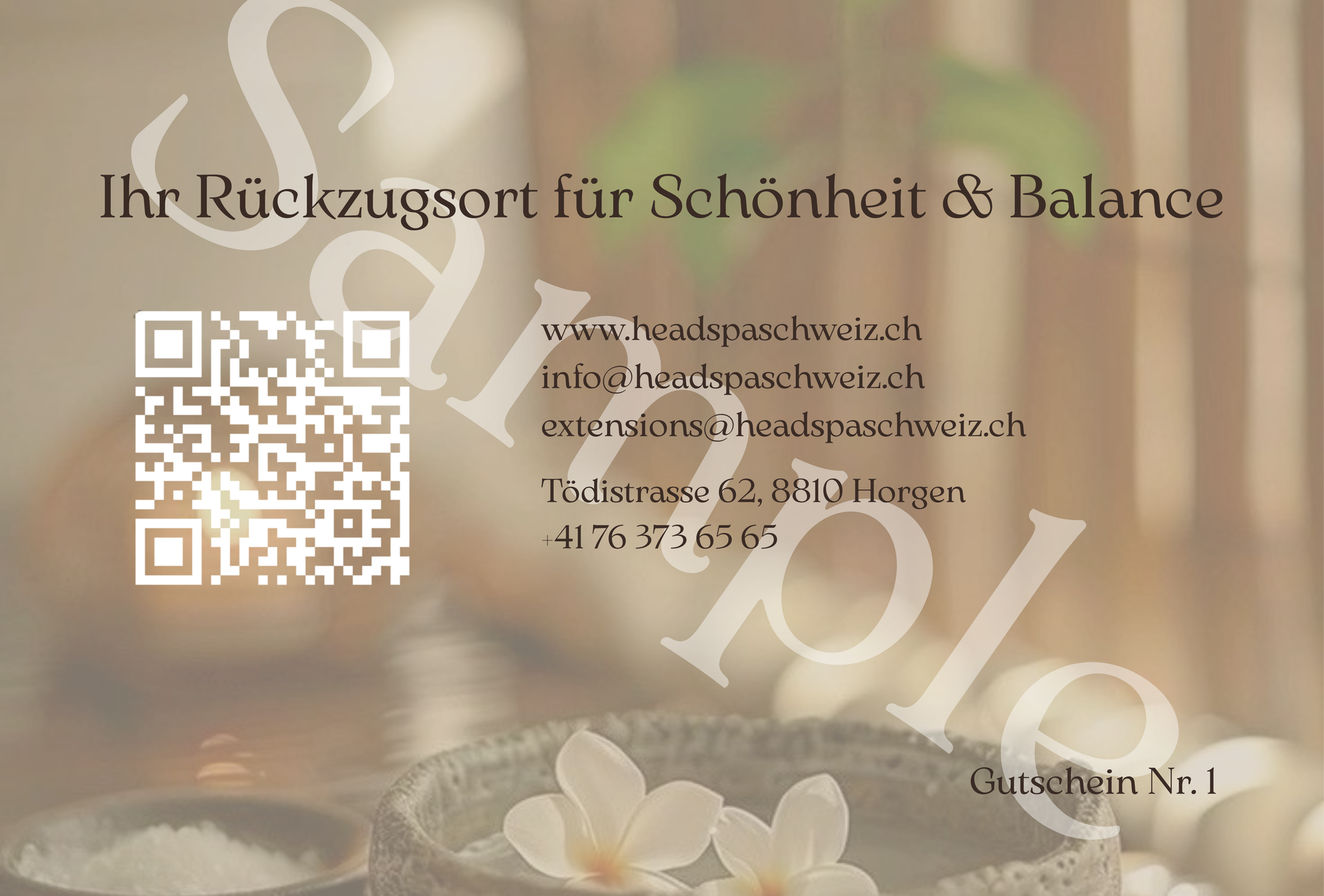 Gutscheine nur auf Anfrage erhältlich. Kontakt per E-Mail oder Telefon. Verschenken Sie pure Me-Time: Der Head Spa Schweiz Geschenkgutschein kommt digital oder als elegante Karte mit Couvert – flexibel einlösbar für unser gesamtes Angebot. Jetzt Gutschein wählen und Freude schenken.
